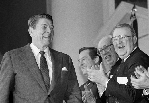 Photo: President Ronald Reagan receives applause from some of his political appointees, Jan. 20, 1984 at Constitution Hall in Washington. From left are Reagan Trade Representative Bill Brock, CIA director William Casey and Edwin Meese, Counselor to the president. (AP Photo/Ira Schwarz)