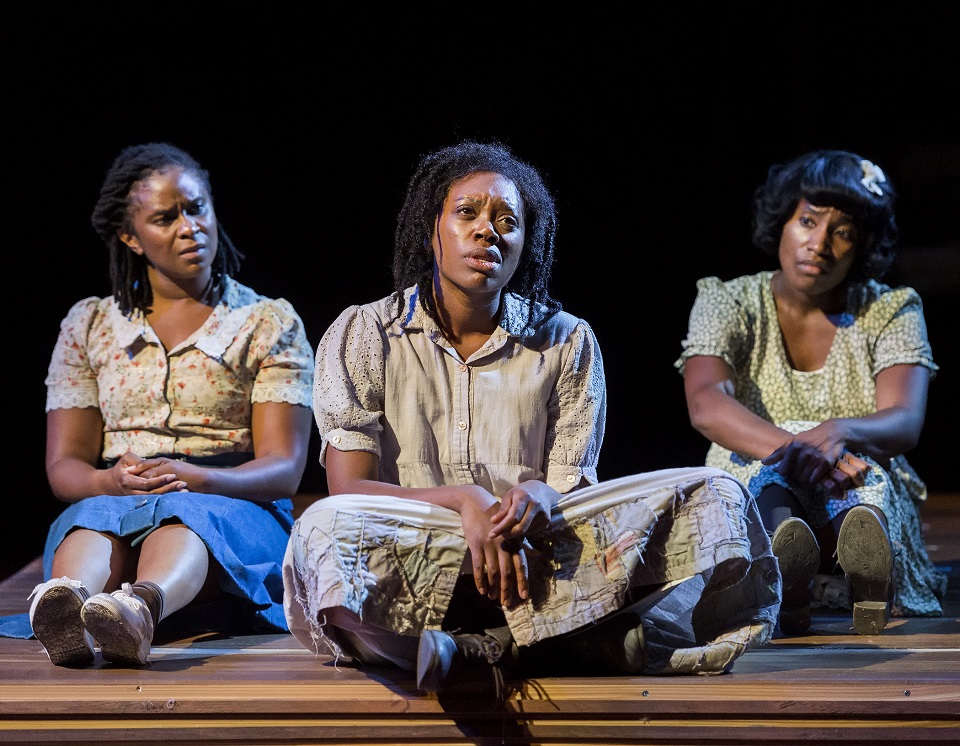 One more evocation of “mirroring,” in both the novel and the play, is a mirror of time. The telling of the story shifts between the young girls themselves and their community (there are eight actors on stage—six women and two men), and the omniscient narration of recall by the wise, thoughtful adults, especially Claudia, these girls have become in later years. The effect of action in both real time and reflected time, often simultaneous, is a constant feature.