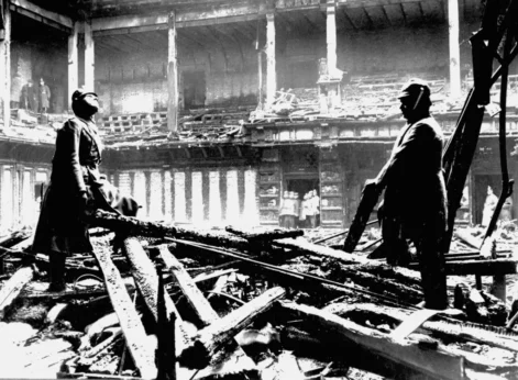 Iconic AP photo of destroyed Parliament Building in Berlin in 1933. Sen. Murphy said it will not be a “Reichstag Fire” which the Nazis used to take over power almost immediately in Germany but a gradual, step by step process that Trump hopes to use to establish fascism in America.| AP