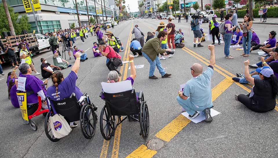 Los miembros de la Coalición local de 14 Sindicatos del Kaiser Permanente (CKPU), hicieron pública su causa (bajos salarios, escasez de personal y negativa a negociar por parte de una cadena de hospitales cuyos gerentes recaudan millones) a través de la protesta callejera frente al hospital más grande del Kaiser en Los Ángeles. hospital, en Hollywood. La policía arrestó a 23.