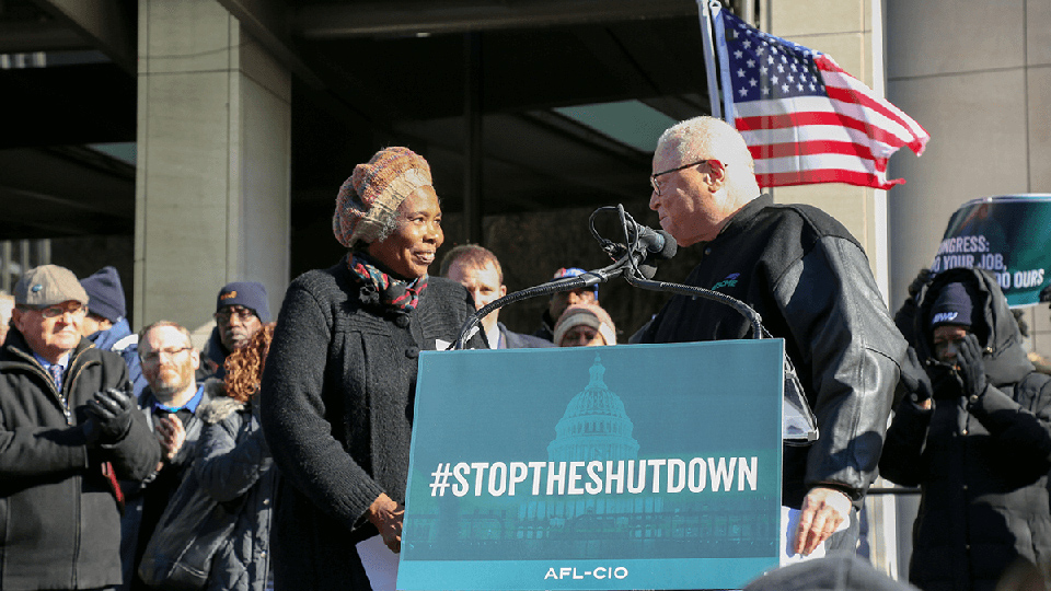 Saunders fue uno de entre dos docenas de oradores que se pronunciaron afuera de la sede de la AFL-CIO para demandar que el Presidente Trump y el Senador Mitch McConnell de Kentucky reabran el gobierno. AFSCME representa a unos 3 mil trabajadores federales.