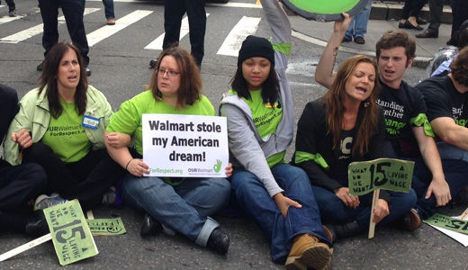 Photo: While Walmart workers like these fight to raise their povery wage of just $9.00 an hour, Doug McMillen, the company’s CEO, earns $9,323 an hour. | AP