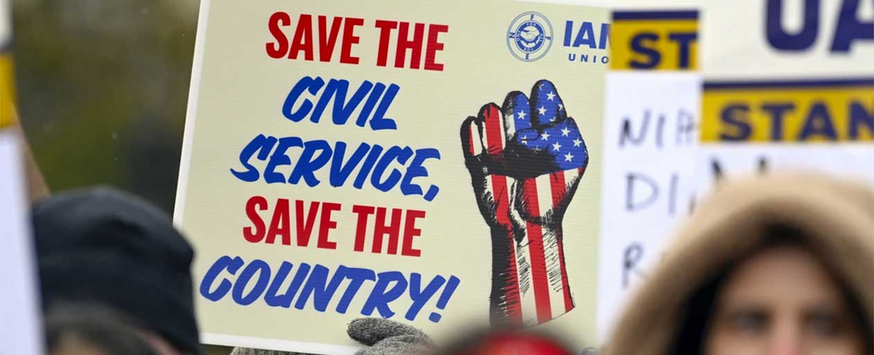 This firing is much bigger and could, if he succeeds, deal a huge blow to the government worker unions—AFGE, the Treasury Employees (NTEU), the National Federation of Federal Employees-IAM (NFFE), National Nurses United (NNU) and smaller sections of other unions, including the Communications Workers and the Professional and Technical Employees.