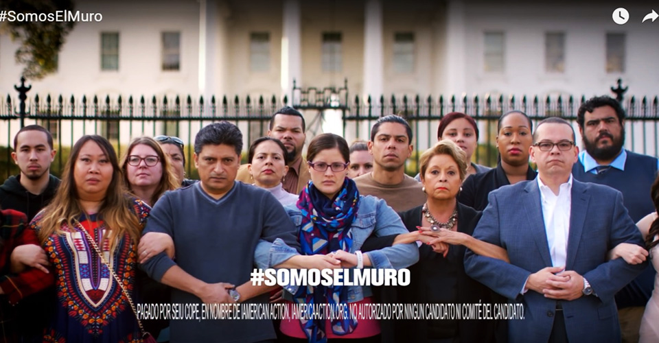“#Somos ElMuro, somos el muro que lo mantendremos a Ud. Fuera de la Casa Blanca” dice el anuncio https://youtu.be/mjtSVTAsgqE . Visualmente muestra docenas de Latinos entrelazados con los brazos en frente de la Casa Blanca, enviando este mensaje: “Tenemos el poder para derrotarte”.