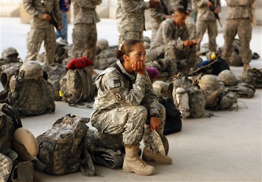 Photo: U.S. Army Sgt. Alma Santiago, 25, from Worcester, Mass., with 2nd Brigade, 10th Mountain Division, waits at Baghdad International Airport as her unit begins their journey to the United States, July 13. The soldiers, based at Fort Drum, N.Y., are headed home after nine months in Iraq as part of the U.S. drawdown of forces, which begins in earnest next month. (AP/Maya Alleruzzo)