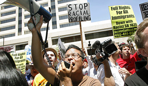 Photo: Carlos Alvarez of Phoenix shouts into a bullhorn during a protest of Arizona’s SB 1070 immigration-enforcement law in front of Maricopa County sherrif’s office Thursday, July 29, 2010 in Phoenix. (AP Photo/Ralph Freso)