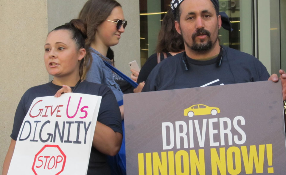 SAN FRANCISCO – Market Street, this city’s main thoroughfare, resounded with auto horns and chants Aug. 27, as a stream of cars bearing Uber and Lyft markers cruised slowly past Uber’s headquarters, and drivers gathered with labor and community supporters to crowd around the ride-share giant’s front door.