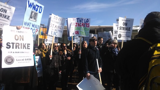 Picketing was set for 9 a.m. -4 p.m., yesterday and today, with rallies at 10:00 and 12:30. More information can be found at uicunitedfaculty.org. There is a solidarity petition at http://usas.org/2014/02/17/students-pledge-support-for-uic-faculty-on-eve-of-strike/.