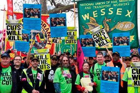 Photo: National Union of Rail, Maritime and Transport Workers (RMT) at last year’s Stop the Cuts rally. RMT Facebook album.