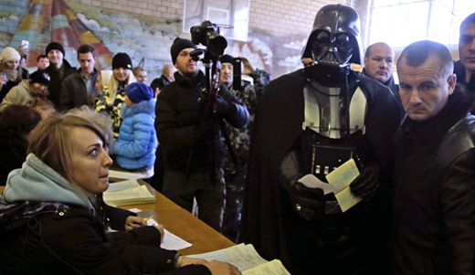 Photo: Darth Vader, previously known as Viktor Shevchenko, the leader of the Ukrainian Internet Party, waits to receive his ballot papers at polling station during parliamentary elections in Kiev Oct. 26. Efrem Lukatsky/Associated Press