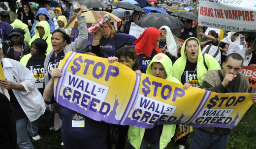 That’s particularly relevant on the bank bailout, which draws mass ire nationwide. The labor federation has led large protests against the banks. It demands the financiers repay the billions the taxpayers lent them, and that the government – and specifically Congress – turn around and order redistribution of those funds to smaller institutions that would lend money to struggling homeowners and to businesses that actually create jobs.
