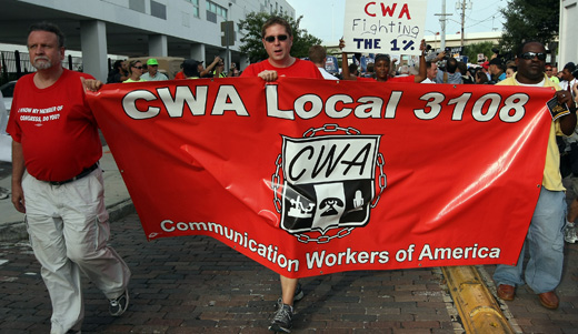 Communications Workers of America member Steve Wisniewoki of Orlando works for AT&T Century Link and said his employer was taken over in the past year by an investment firm similar to Bain Capital, a company that Romney once headed. Since the takeover, the investment firm has stopped paying into pensions for new hires. “They are taking away our overtime,” said Wisniewoki, who is also the local union president.