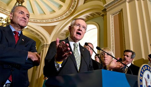 Photo: Senate Majority Leader Harry Reid, D-Nev. (center) speaking at a press conference in Washington, D.C. At left is his colleague Senator Charles Schumer, D-N.Y. J. Scott Applewhite/AP
