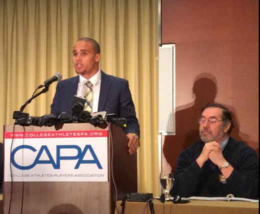 Photo: Northwestern Wildcats quarterback Kain Colter speaking, USW President Leo Gerard seated. CAPA Twitter.
