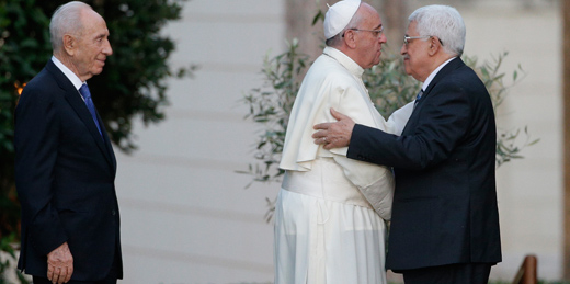 Photo: In this June 8, 2014, photo Pope Francis and Palestinian President Mahmoud Abbas embrace each other as Israel’s President Shimon Peres, left, watches during an evening of peace prayers in the Vatican gardens. Gregorio Borgia/AP