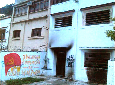 The building under fire bomb attack, in the Artigas section of Caracas, serves as both JCV headquarters and offices of a local branch of the Communist Party of Venezuela (PCV).