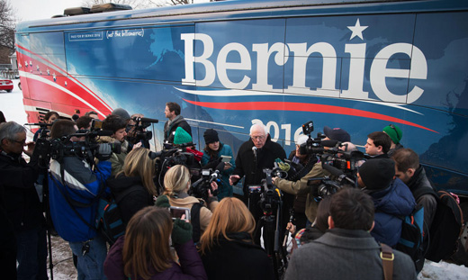 Photo: Sanders speaks to members of the media after a campaign stop at U.M.B.A. Hall in Pottawattamie, Iowa on Jan. 19. | Andrew Harnik/AP