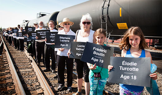 Photo: In Portland, activists hold up signs with the names of those who died in the Lac-Megantic disaster. | Portland Rising Tide