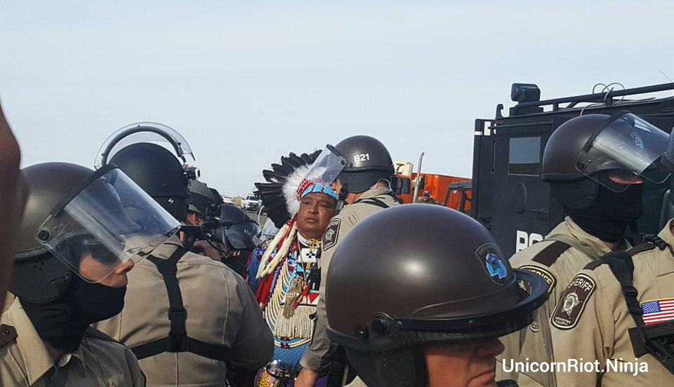 The water protectors are standing their ground in this face of this hideous, racist assault by these police. This can only end in tragedy.