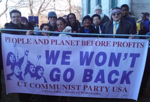 “I am marching because women’s rights are human rights and we are prepared to stand up every day of this administration for the rights of everyone,” said one participant in the Communist Party delegation at the Women’s March rally at the state capitol in Hartford, Connecticut. The CPUSA is one of over 500 partner organizations of the Women’s March that have joined together. Organizers had called the sister rally two weeks earlier. The turnout of 10,000 was the largest of any in recent times, adding to the state’s 80 charter buses to Washington DC and many hundreds more who traveled to the Boston and New York sister marches.