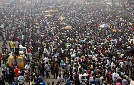 Photo: Overhead view of massive protests on day five of the nationwide strike following the removal of a fuel subsidy by the government, in Lagos, Nigeria, Jan. 13. Sunday Alamba/AP