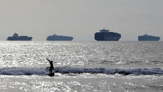 Photo: Surfer rides a wave, Feb. 20, in Sunset Beach, Calif., as enormous loaded cargo ships are anchored outside the Ports of Long Beach and Los Angeles. AP Photo/Jae C. Hong