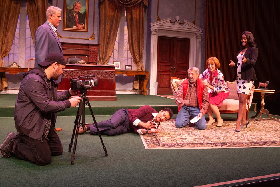 The premise of the play is that the previous governor of this small state has been forced to resign because of a sex affair. His oily, garish, grinning red-tie portrait still hangs over his desk. The pathologically timid lieutenant governor, tongue-tied Ned Newley (Stephen Rockwell), selected because he’s an efficient policy wonk but whose mousy temperament offered no threat to the ebullient, now defenestrated politician, is now almost unbelievably the governor but is subject to a special election. A boisterous cast includes the governor’s pollster Paige Caldwell (Natalie Storrs), Newley’s chief of staff Dave Riley (Nikhil Pai), a hot-shot political consigliere Arthur Vance (Jonathan Bray), who grasps how perfect Newley would be, “real” as he is, for the governorship and maybe even for national office. There’s the clueless ditz Louise Peakes (Susan Huckle), known familiarly as Lulu (and is she ever!), a terminal maladroit who appears as a one-day temp receptionist and improbably (“I don’t know what I’m doing, but I’m confident”) leaps to prominence under Vance’s sagacious guidance. Finally, there’s the compromised media in the person of TV reporter Rachel Parsons (Taylor Popoola) and her grunting cameraman A. C. Petersen (Thomas Anawalt), representing the common man.