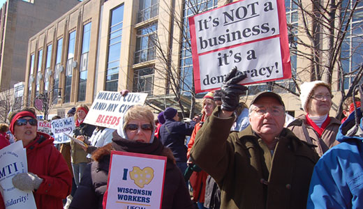 Photo: In the crowd at the state Capitol, Madison, Wis., March 12. (People’s World)