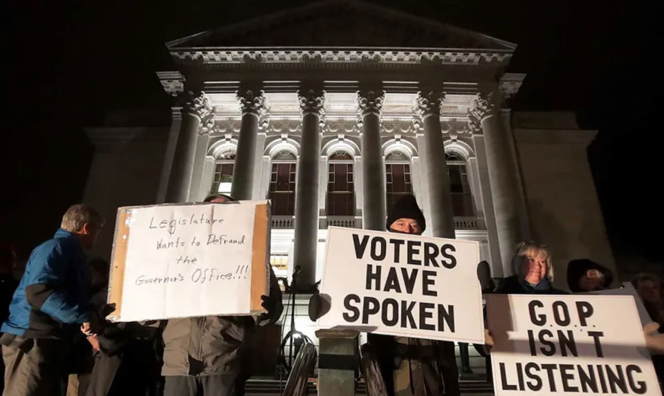 The package of bills – formulated Friday (Nov. 30) and vaguely outlined in one crowded 10-hour hearing Monday – was approved with some adjustments despite thousands of Wisconsin residents filling hallways and phone boards with thoughtful pleading remarks about the illegality of all of this. It then went to the departing governor to become law as Democrats decried the obvious ugly sour grapes that once seemed outside the boundaries of partisan machinations.