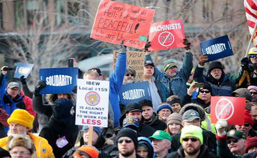 Photo: Workers demonstrate against right-to-work (for less) at the state Capitol in Madison. | John Hart/AP & Wisconsin State Journal