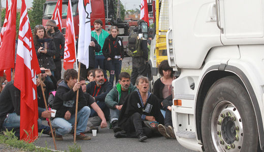 Photo: Union activists block the entrance of the industrial area in Boucau, southwestern France, on a day of nationwide strikes and protests over a labor reform, May 26. Bob Edme | AP