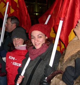 The rally had a campaign atmosphere, since federal elections are fast approaching on Dec. 2. The Communist Party of the Russian Federation (CPRF) is fielding a slate of candidates headed by General Secretary Gennady Zyuganov, including Zhores Alferov, a Nobel Prize-winning physicist, and cosmonaut Svetlana Savitskaya, the second woman in space. The CPRF is the main opposition party to the Putin government.