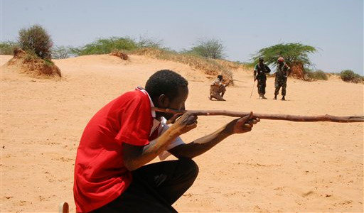 Photo: Somali army recruits train using sticks instead of guns at Camp al-Jazira, the government’s main military base, in Mogadishu. (AP/Katharine Houreld)