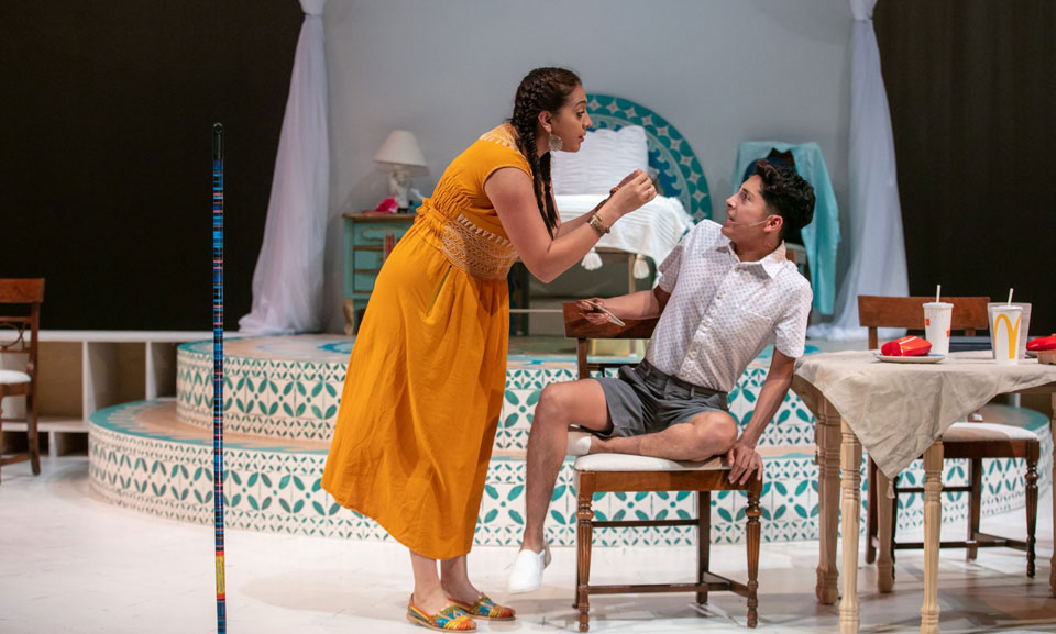 The stage set itself almost deserves its own review. It’s designed to highlight different staging areas in Molly’s home, including Alex’s bedroom set off by a circle of diaphanous curtain, as well as a heavenly perch upon which Juana’s visage appears as an honored memory after she has left the family employ. The lighting design perfectly captures the magic of Juana’s Indigenous talents, thunder and lightning storms, apparitions. A very funny recurring joke involves the steaming herbal teas that Juana prepares for appropriate functions—one to make you happy, one to make you shut up, another to make you tell the truth.