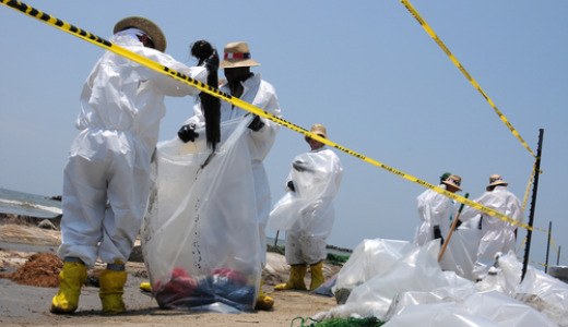 Photo: A Health Safety and Environment worker collects pieces of an oiled snare boom so it can be disposed of safely May 29, in Port Fourchon, La. Hundreds of HSE workers contracted by BP and under the direction of the U.S. Coast Guard are cleaning up oil from the Deepwater Horizon/BP oil spill, which began washing up on beaches here one month after the drilling rig exploded and sank. U.S. Coast Guard photo by Petty Officer 3rd Class Patrick Kelley.