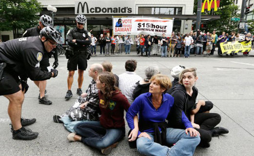 Photo: Young workers, including fast food workers, may not have yet unionized, but they are holding demonstrations all over the country for decent wages and working conditions. At the ILCA convention, union leaders said older workers need to be mindful of the new generation’s values and struggles. Elaine Thompson/AP