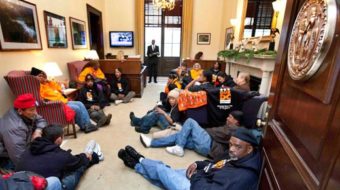 December 7, 2011Protesters from Ohio sat down in the corridor outside House Speaker John Boehner's office, "bearding the corporate Grinch in his den."