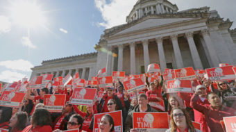 May 19, 2015Thousands of union school workers in 60 districts across Washington are staging a "rolling one-day walkout" to protest the Republican-controlled State Senate's refusal to fully fund public schools.