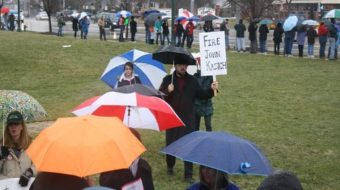 March 17, 2011Huddling under a sea of umbrellas on a cold, rainy day, hundreds of union workers and their supporters rallied while chanting "Union Yes" and singing "Which side are you on."