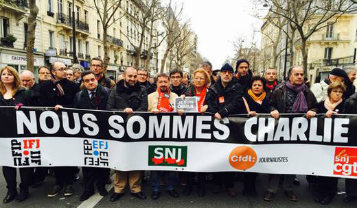 Photo: The International Federation of Journalists and its regional group, the European Federation of Journalists, joined the million-strong march in Paris protesting against the terrorist attack against the French satirical magazine Charlie Hebdo. The IFJ and EFJ marched with their three member unions in France — Syndicat national des journalistes (SNJ), Syndicat national des journalistes-confédération générale du travail (SNJ-CGT) and CFDT — at the head of the demontration, behind the families of the killed journalists.