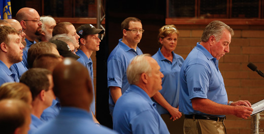 Photo: UAW Secretary-Treasurer Gary Casteel stands with Volkswagen Chattanooga employees as he speaks during a news conference July 10 to announce the formation of a new local. Despite narrowly losing a representation election the UAW set up Local 42 to represent Volkswagen workers in Chattanooga who did support the union and they expect the local will become the official bargaining rep for the entire plant when a majority of VW employees join. It is expected that this approach will be taken widely across the South and other parts of the country. Doug Strickland/ Chattanooga Times Free Press/AP
